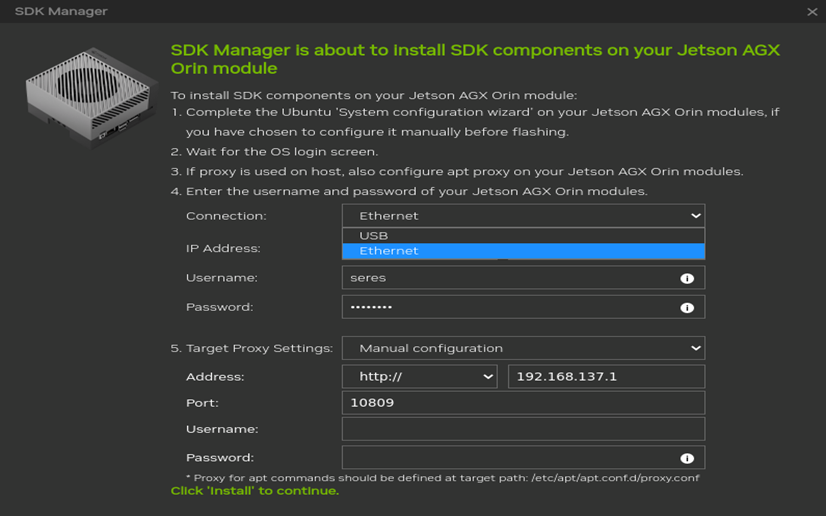 更新SDK时可以选择USB方式更新和Ethernet方式更新,这里推荐采用Ethernet方式更新,因为USB线缆接入后我的电脑貌似没法与其组成局域网。通过以太网方式更新,我可以让AGX Orin开发板连接至我电脑的热点,并获取到其对应的IP地址。